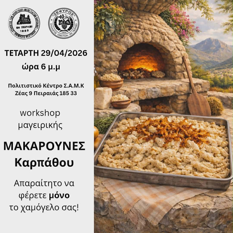 ΠΡΟΣΚΛΗΣΗ Ο Σύλλογος Απανταχού Μενετιατών Καρπάθου "Η ΚΟΙΜΗΣΙΣ ΤΗΣ ΘΕΟΤΟΚΟΥ" και ο Σύλλογος Απανταχού Οθειτών Καρπάθου «Ο Ζέφυρος» σας προσκαλούν σε ένα ξεχωριστό ταξίδι γεύσης και παράδοσης! Την Τετάρτη 29 Απριλίου 2026 και ώρα 18:00, στο Πολιτιστικό Κέντρο Σ.Α.Μ.Κ. (Ζέας 9, Πειραιάς Τ.Κ 18533), σας περιμένουμε σε ένα αυθεντικό workshop μαγειρικής αφιερωμένο στις παραδοσιακές μακαρούνες Καρπάθου. Μέσα σε μια όμορφη ατμόσφαιρα και με καλή παρέα, θα γνωρίσουμε από κοντά τα μυστικά της συνταγής, θα μοιραστούμε ιστορίες και θα γευτούμε τοπικές γεύσεις που περνούν από γενιά σε γενιά. Ένα βιωματικό απόγευμα γεμάτο άρωμα παράδοσης, απλότητα και φιλοξενία. Εσείς φέρτε μόνο το χαμόγελό σας! Σας περιμένουμε με χαρά! ![]() |